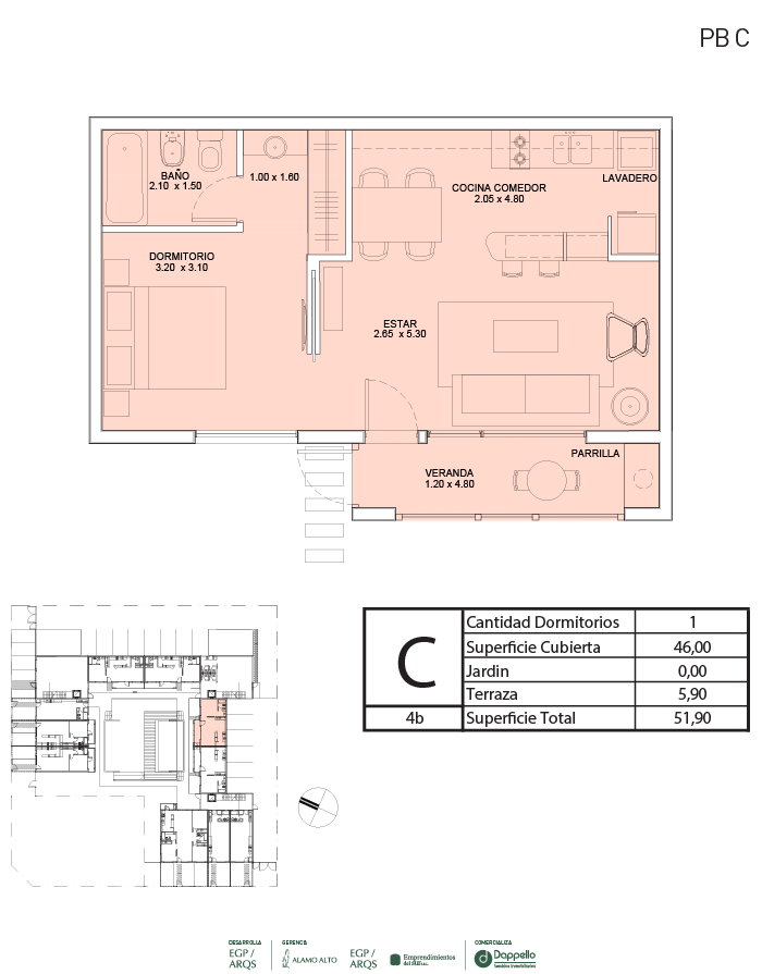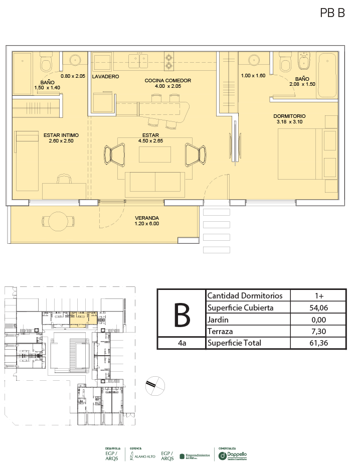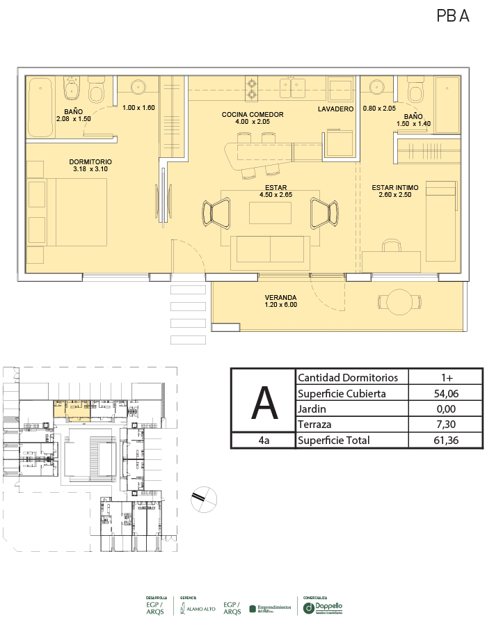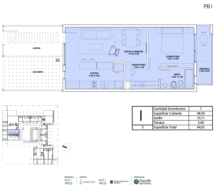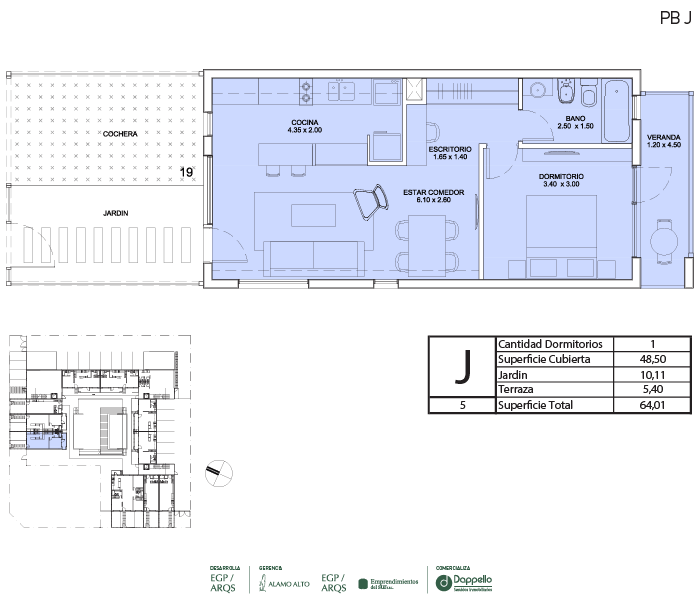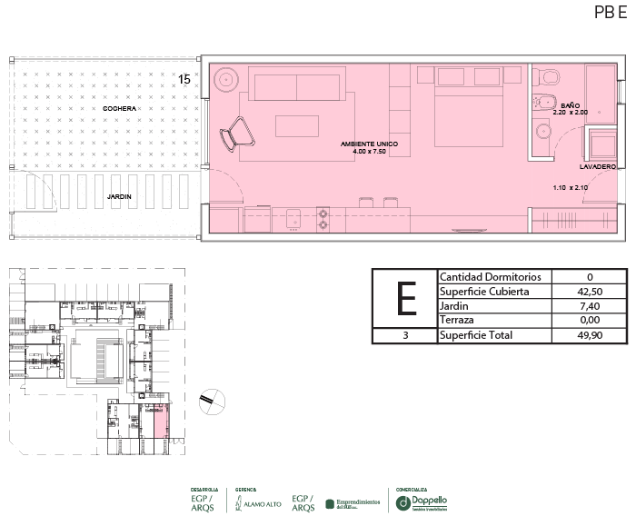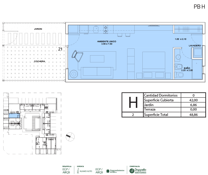 La PLANTA BAJA del edificio se destaca por caracterizar y definir claramente la apropiación de cada espacio del proyecto. Desde la entrada principal, con ingreso por calle Calderón, se llega a un jardín central con pileta climatizada, que articula y distribuye a las unidades interiores. Las galerías y jardines privados separan el interior de las viviendas de planta baja del espacio público.